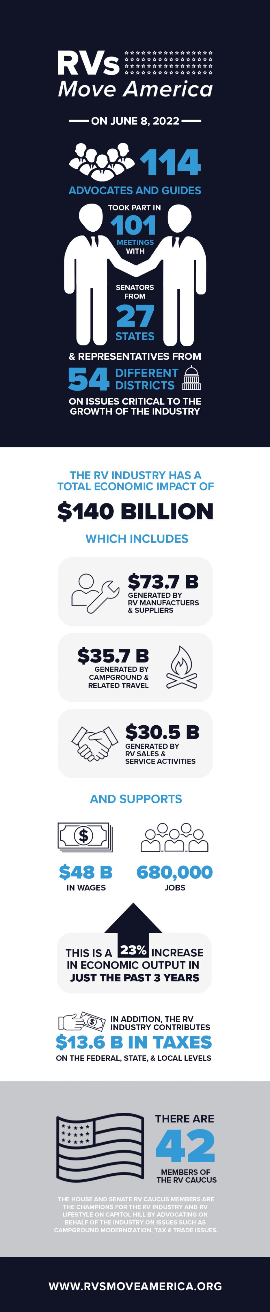 RVs Move America Week 2022 was a huge success. Last week 114 participating advocates and guides took part in 101 meetings with Senators from 27 states and Representatives from 54 different districts on issues critical to the growth of the industry. This all happened during Advocacy Day on Capitol Hill, a day organized by the Government Affairs team, which places the RV industry agenda front and center, and capped off an exciting RVs Move America Week. Check out the infographic below to learn more about the week!