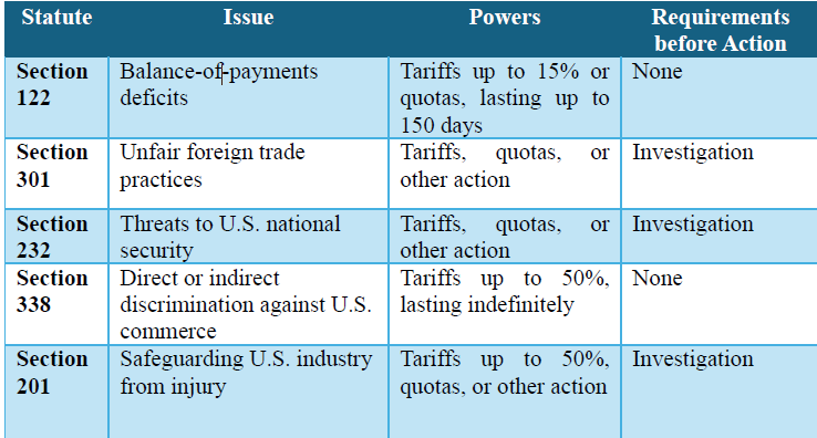However, those statutes are more limited in their authority. For example, Section 122 allows the president to impose tariffs but limited to 15% and only up to 150 days. Section 301 requires an investigation by the Commerce Department and US Trade Representative.
