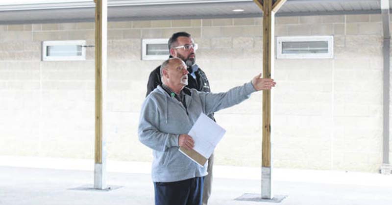 (Greg Freistuhler, plan operations director at Wilson Health, discusses the plans for setting up a COVID-19 testing site at the Shelby County Fairgrounds with Wilson Health Administrator Dave Buchanan. Photo credit: Sidney Daily News)